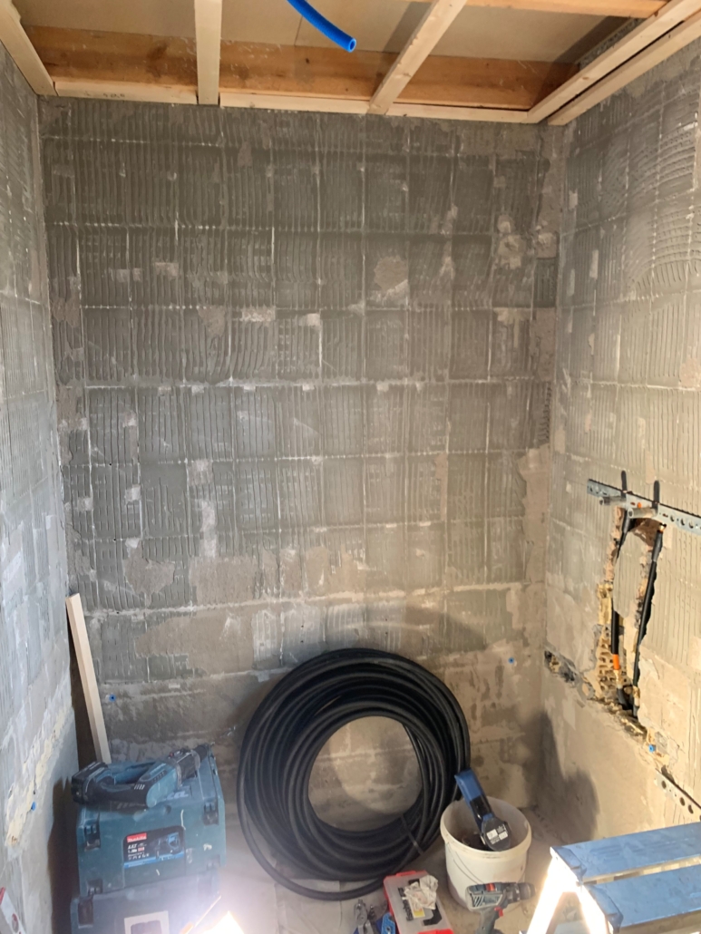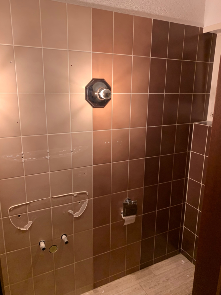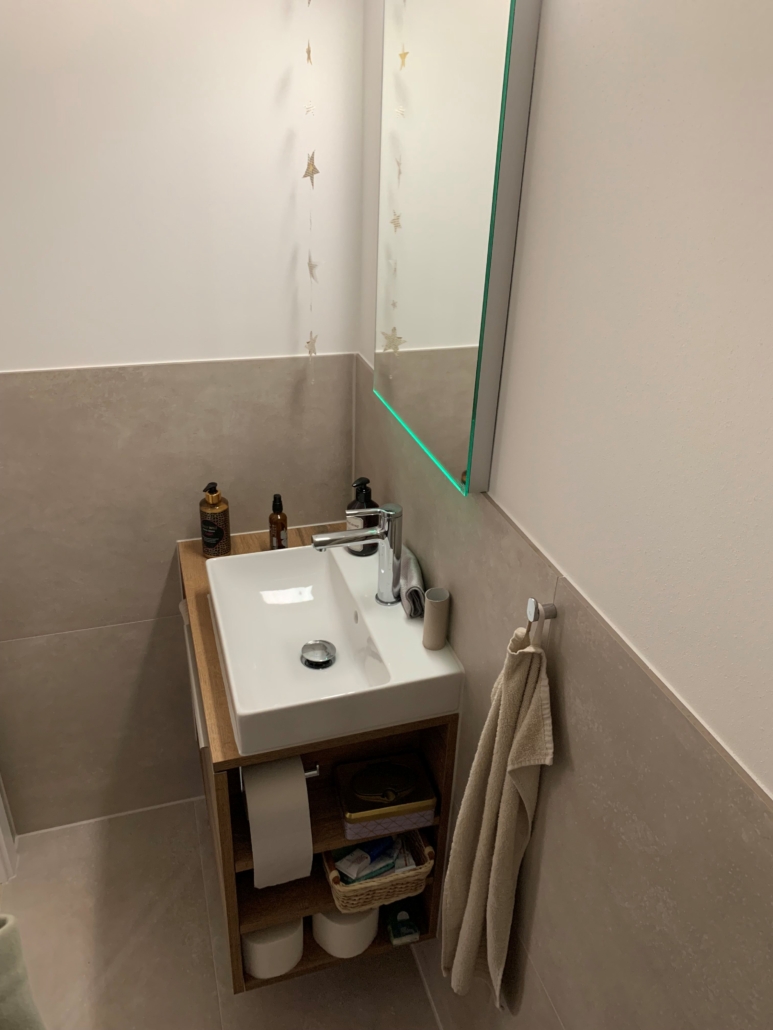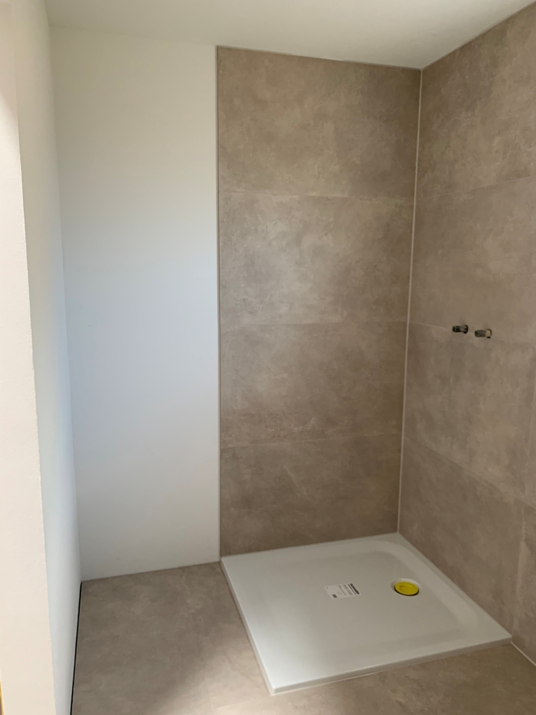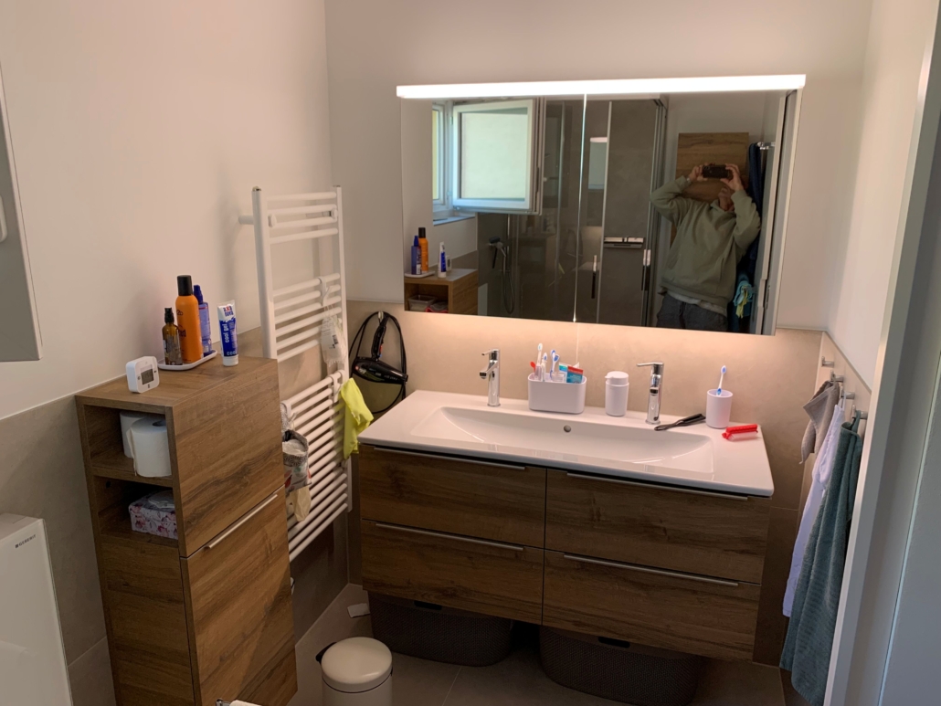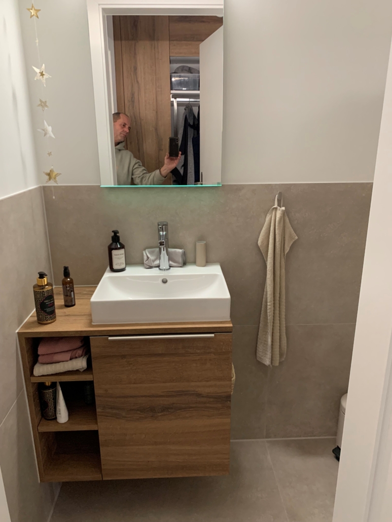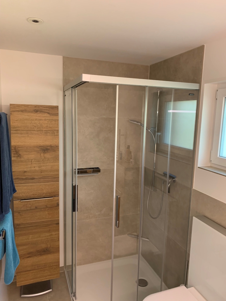 Vom kompletten Rückbau mit entfernten Wand- und Bodenplatten über den fachgerechten Ausbau bis zum fertigen Bad. Maurer-, Gipser und Malerarbeiten wurden ausgeführt. Die Badmöbel wurden individuell entworfen und vom Schreiner hergestellt.